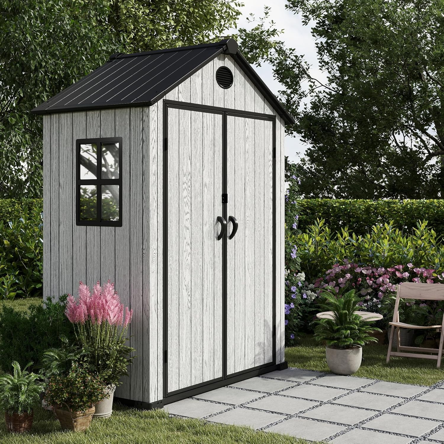 - Side Window for Light and Ventilation, A small built-in window on the side of the shed improves air circulation and natural light, ideal for use in your backyard, patio, or garden space.
