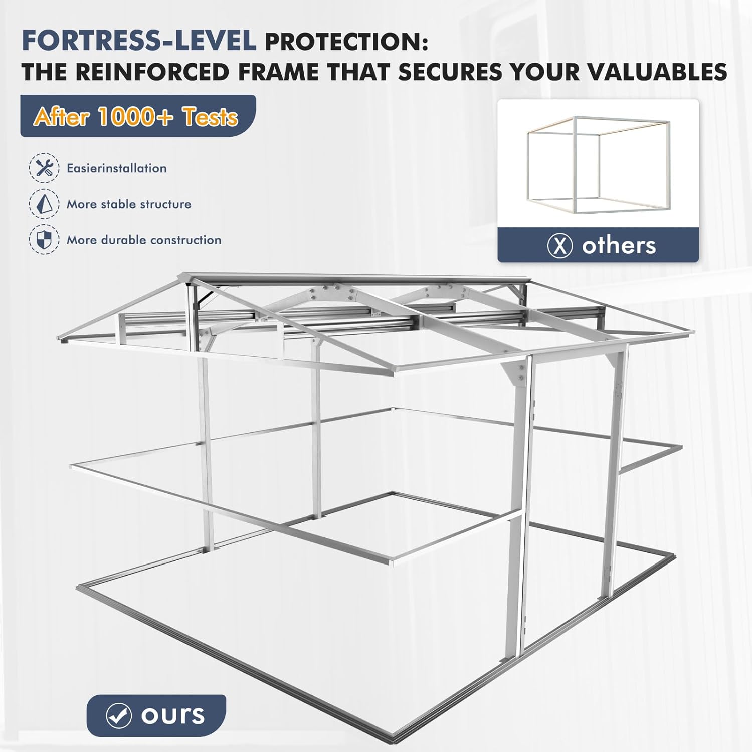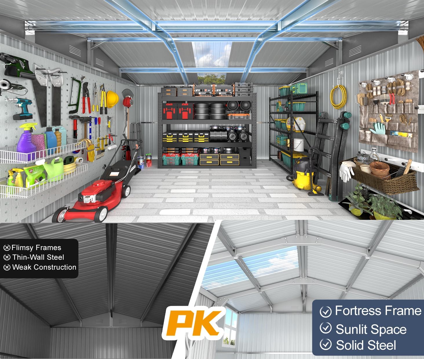 - πͺ Forged for Superior Strength: The skeleton of our shed is constructed from 0.6mm-thick (22-gauge) heavy-duty galvanized steel, far surpassing flimsy alternatives. Weβve engineered superior strength with an apex-braced roof and reinforced wall columns, creating a structure that fiercely resists warping and sagging. This is a true fortress for your valuable lawn mower, bikes, and equipment.