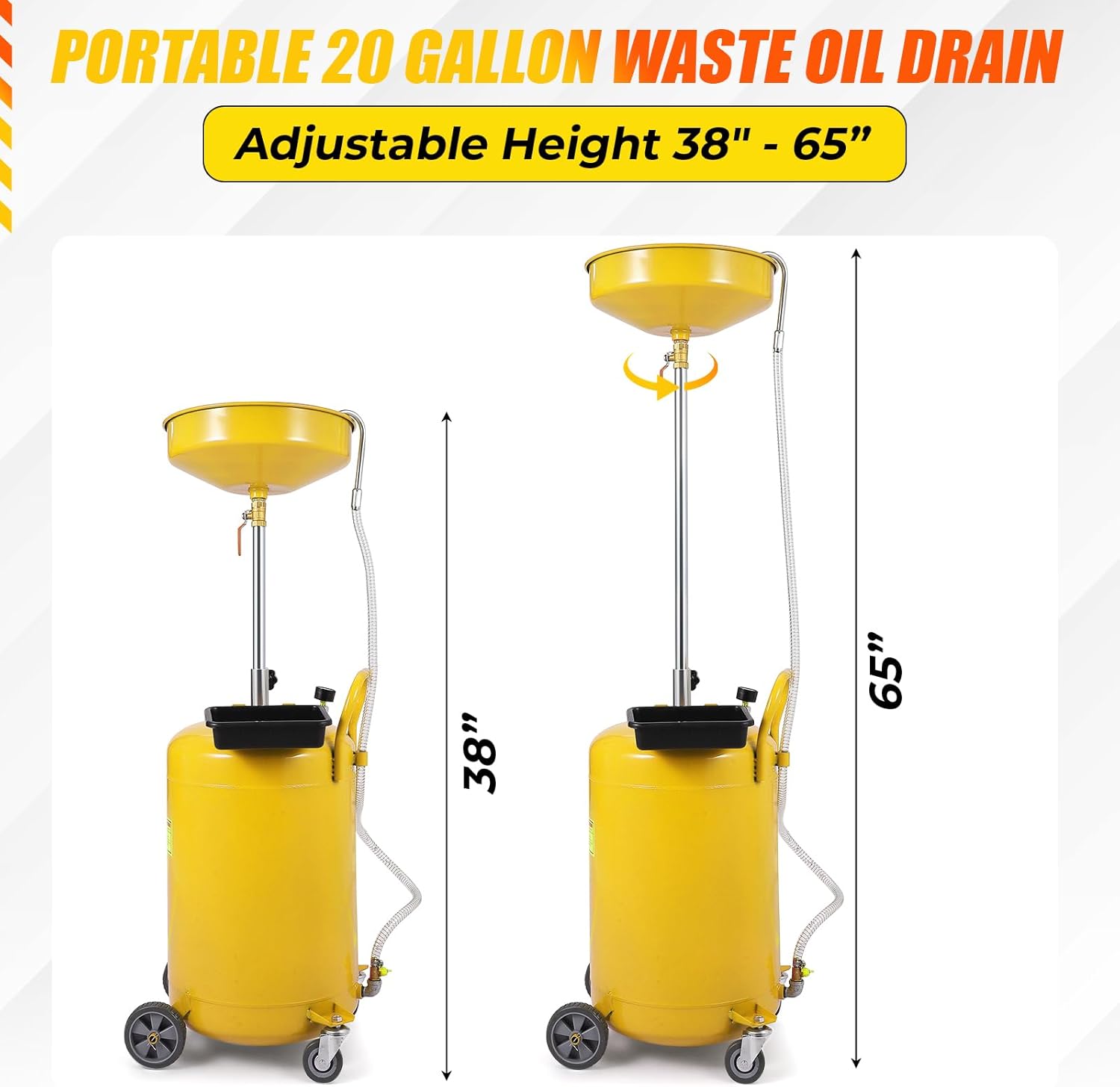 20 Gallon Waste Oil Drain Tank Portable Air Operated Oil Drainer with Adjustable Funnel Height 38-65 Inches 15 Inch Funnel Fluid Fuel Transfer Drain Container with 360 Degree Wheels and Toolbox Yellow