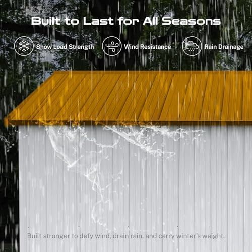 - ā [Sloped Roof for Superior Weather Protection] Designed for real-world conditions, the efficient sloped roof system guarantees optimal rainwater drainage, preventing damaging pooling and leaks. This key feature in our storage buildings and sheds clearance design minimizes maintenance and ensures your tools, equipment, and belongings stay consistently dry inside