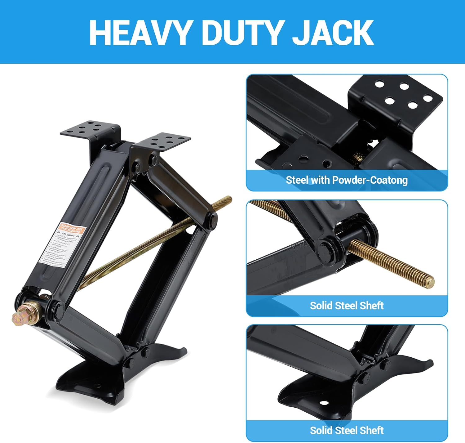 - Heavy Duty 7500lb Load Capacity: the heavy-duty RV scissor jacks,engineered for strength, support up to 7500 lbs, ensuring secure and stable support for your RV, trailer, or camper. Ideal for leveling and stabilizing, they provide a safe and reliable setup.