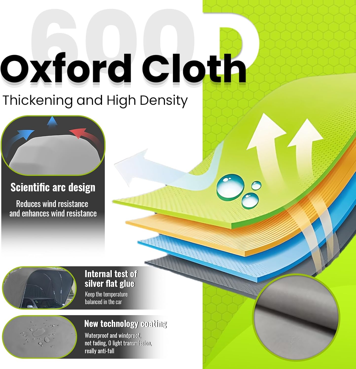 - Outdoor All-Weather Car Cover: Made of 600D reinforced Oxford fabric and a stainless steel frame. The 600D reinforced Oxford fabric features a flat-glue inner layer. It is waterproof, sun-proof, windproof, and tear-resistant, ensuring durability.