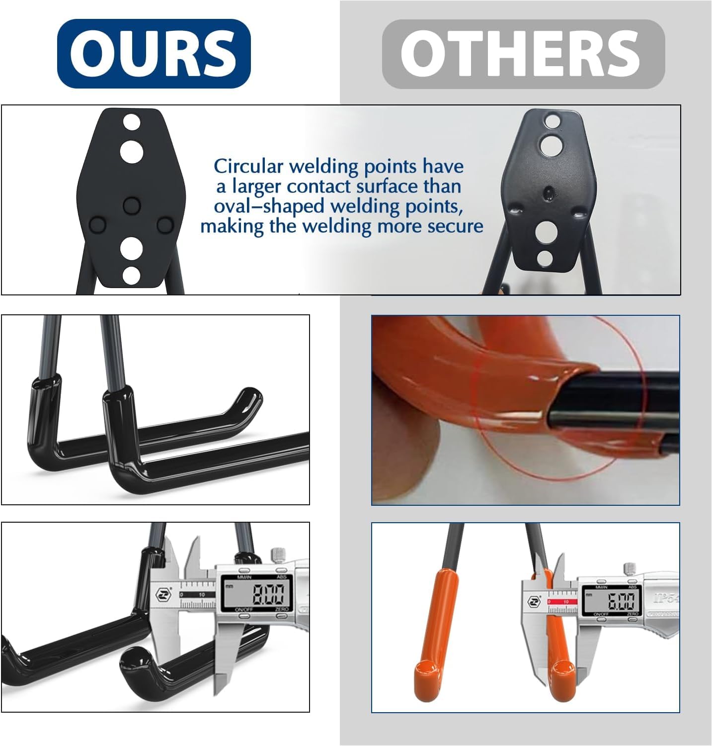 - Upgrade Design for Garage Storage Hooks: Different from other similar garage hooks heavy duty with oval-shaped welding points, our designed circular welding points. These provide a larger contact surface between the hook and the backboard, offering higher security. With this design, thereβs no need to worry about the rear steel panel splitting or falling off, a perfect choice of wall hooks for hanging heavy duty