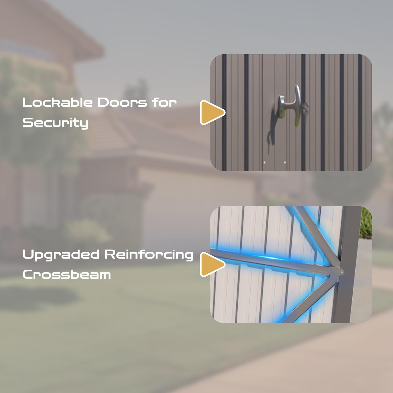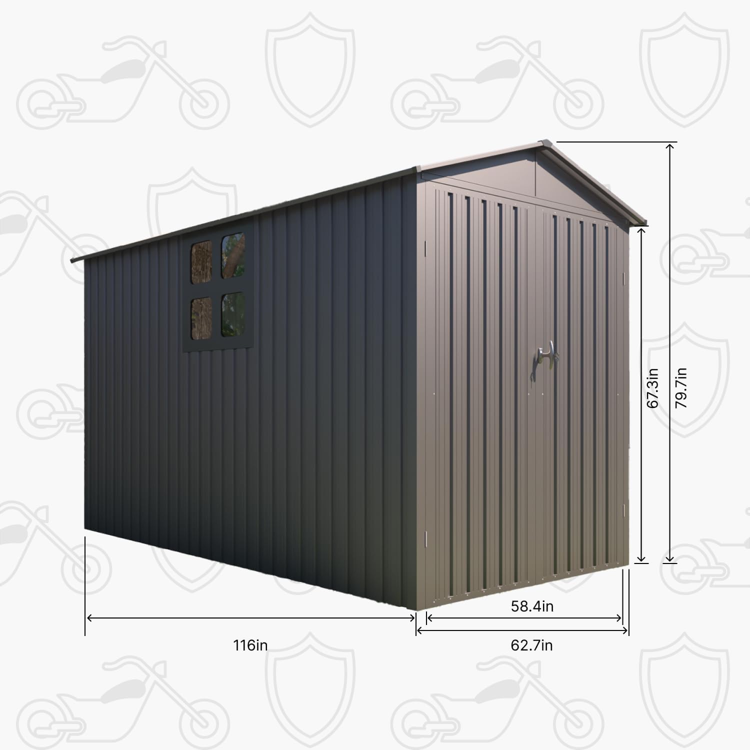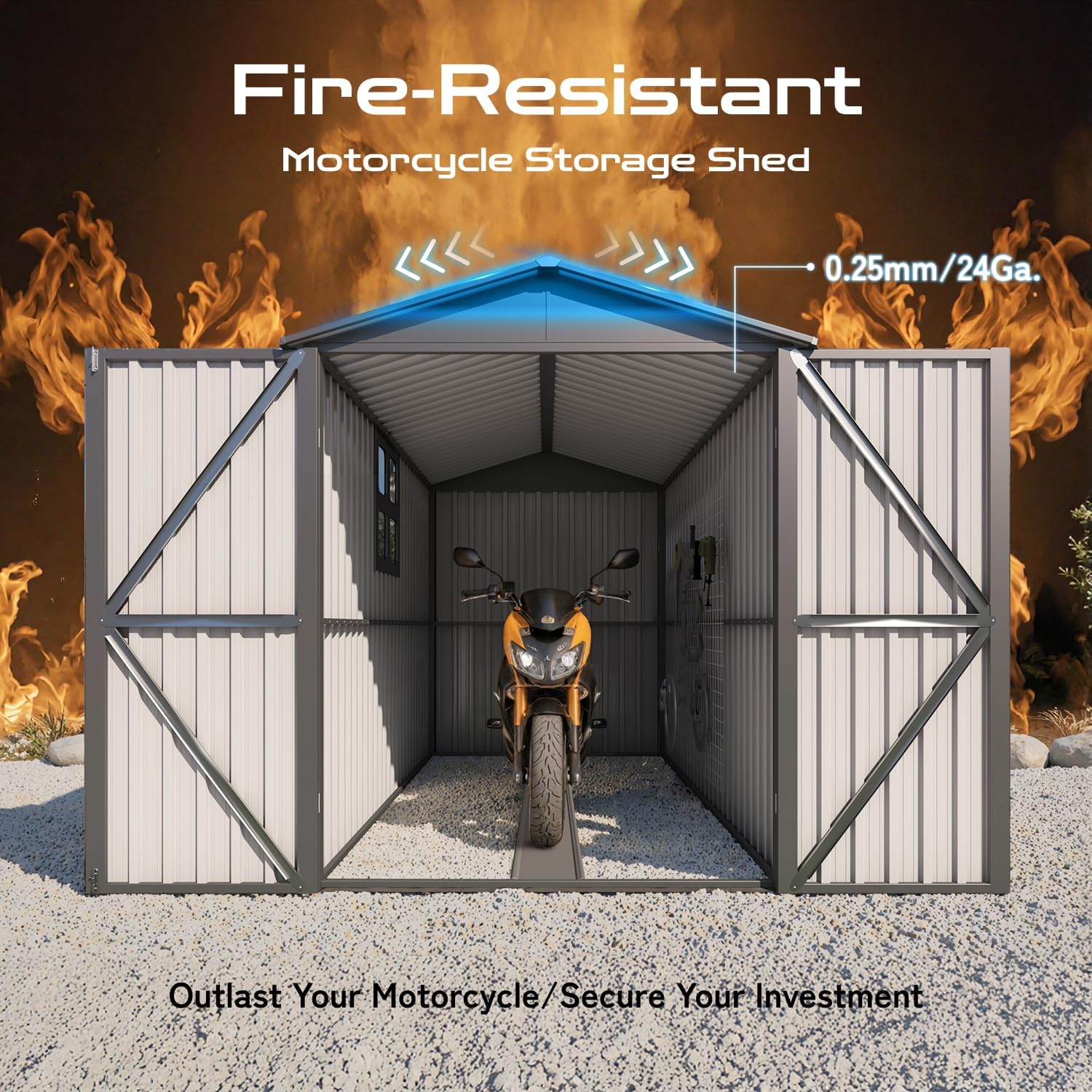 - [Fireproof & Anti-Theft] Steel motorcycle storage sheds deliver unmatched fire resistance and a tamper-proof lock system. This heavy duty vehicle shed safeguards bikes, tools, or heirlooms with dual-layer security—ensuring your valuables stay protected around the clock