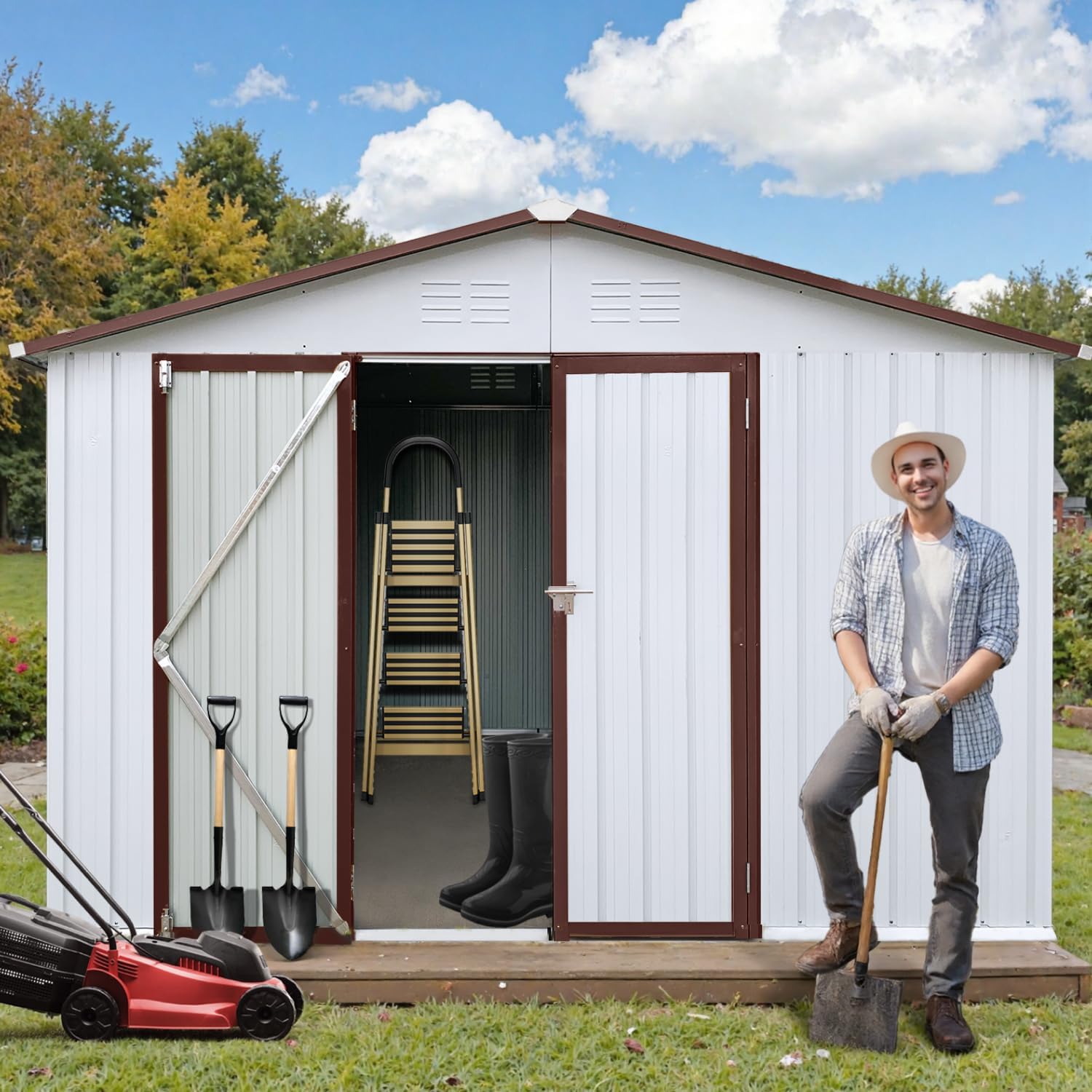 10 x 12 FT Outdoor Storage Metal Shed, Garden Bike Shed with Slooping Roof, Lockable Doors and Windows, All-Weather Tool Shed Easy to Assemble for Backyard, Patio, Lawn, White